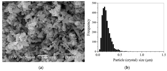 SEM image (a) and crystal size distribution (b) of the initial ZnO powder. Mean size dmn = 0.193 ± 0.002 μm, median size dmd = 0.174 ± 0.002 μm.