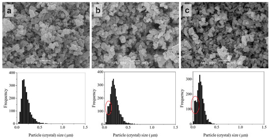 The initial ZnO crystals possessed different habitus and mainly the size range was at 0–0.5 µm with a median of 0.174 ± 0.002 µm (Figure 3). After impregnation by ZnAc (ZnO@ZnAc), thin elongated crystals disappeared, but the size range of the powder crystals was preserved. At the same time, an increase of ZnAc amount in the powder from 0.5 to 2.5 wt.% was accompanied by an increase in the proportion of small crystals (Figure 4). First it appeared as a shoulder on the left wing of the histogram (circled at Figure 4b), and then as an obvious fine component of size distribution (circled at Figure 4c).