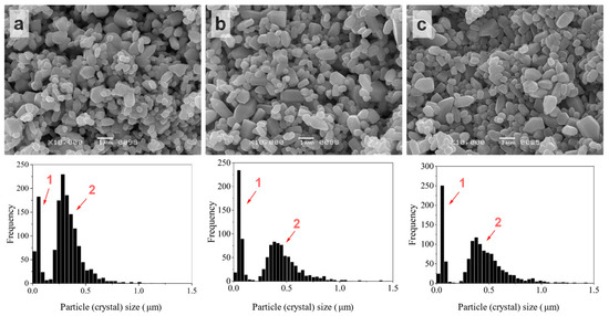 SEM images and crystal size distributions of ZnO powder after ZnAc introduction by impregnation combined with TVT: ZnO@AcZnTVT(0.5%) (a), ZnO@AcZnTVT(2.5%) (b), ZnO@AcZnTVT(5%) (c). 1 and 2 indicated fine and coarse components of size distributions, correspondingly.
