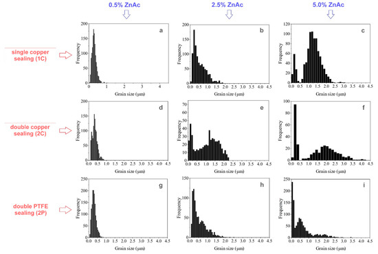 Grain size distributions of ceramics prepared from ZnO powder impregnated by 0.5 wt.% of ZnAc (a,d,g), 2.5 wt.% of ZnAc (b,e,h) and 5.0 wt.% of ZnAc (c,f,i) after CSP with the use of different types of sealing.