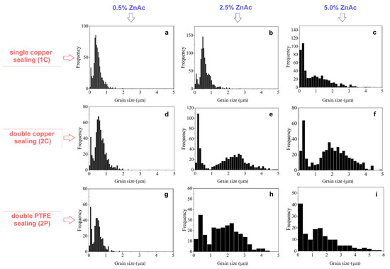 Grain size distributions of ceramics prepared from ZnO powder activated by impregnation and TVT (a,d,g—0.5 wt.% of ZnAc; b,e,h—2.5 wt.% of ZnAc; c,f,i—5.0 wt.% of ZnAc after CSP with the use of different types of sealing.