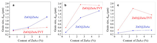 Figure 6 showed the change in the average ZnO crystal size with the increase of ZnAc content for two methods of powder activation. Impregnation combined with TVT leads to gradual growth of mean and median crystal sizes with the increase of ZnAc. Due to the addition of 5.0 wt.% of ZnAc, the crystal size of powder increased twice compared to the initial ZnO. This crystal growth originates from the formation of the coarse component of the size distribution (Figure 5). In contrast, when the powder was only impregnated, the average crystal size, as well as median, decreased because of the formation of a fine component in its size distribution.