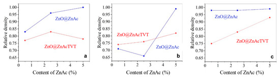 Figure 11 showed the change in the relative density of CSP samples. In general, the growth of crystalline grains with an increase of the ZnAc content resulted in densification of ceramic samples. The highest relative density (over 0.95) was achieved due to the introduction of 5.0 wt.% ZnAc by impregnation for all three types of sealing (1C, 2C, 2P). The exception appeared in the series of samples manufactured from ZnO@ZnAcTVT powder with single copper sealing (Figure 11a). This could be explained by poor reproducibility of vapor pressure in the case of 1C sealing because of uncontrollable water leakage from the die. At the same time, PTFE sealing allows the relative density over 0.95 to be achieved at any of the ZnAc concentrations considered for the series of ZnO@ZnAc. The influence of the sealing type on the relative density of the ZnO was clearly showed in the samples produced from ZnO@ZnAcTVT powder. Especially if die was sealed with two PTFE rings, a proportional increase in the density of samples occurred from 0.75 at 0.5 wt.% to 0.93 at 5 wt.% of ZnAc (Figure 11c).