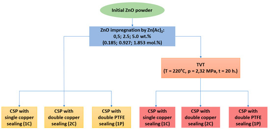 Activation of the initial ZnO powder was carried out in two ways (Figure 14). The first way included ultrasonication of ZnO powder in ZnAc water solution followed by evaporation and drying in air at 70 °C for 12 h. The obtained ZnO impregnated by ZnAc (ZnO@ZnAc) was ground in an agate mortar with a pestle and sieved through a sieve with a cell of 300 μm. ZnAc concentrations in the solutions supported zinc acetate contents in ZnO@ZnAc samples of 0.5; 2.5 and 5.0 wt.% (0.185; 0.927 and 1.853 mol.%, correspondingly). Another way of activation consisted of the impregnation procedure described above followed by a treatment of ZnO@ZnAc in water vapor (thermo-vaporous treatment, TVT). ZnO@ZnAc powder was placed into a PTFE container supported inside the stainless-steel autoclave. An amount of distilled water equal to 20% of the free volume of the autoclave was poured outside the PTFE container. The autoclave was sealed and heated up to 220 °C. ZnO@ZnAc powder was held in vapor state at 220 °C and 2.32 MPa for 20 h.