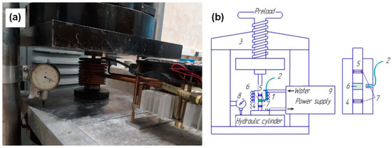 Equipment for cold sintering process (a) and its scheme (b): 1—induction heating; 2—thermocouple; 3—hydraulic press; 4—press form; 5—set of punches; 6—ZnO powder; 7—sealing; 8—sensor; 9—power supply.