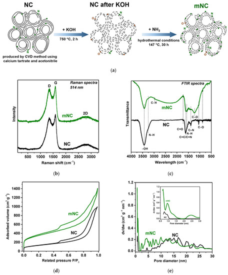 The modification procedure used is schematically shown in Figure 1a. The starting NC was obtained by chemical vapor deposition (CVD) of acetonitrile on a template, formed as a result of the thermal decomposition of calcium tartrate [43,50]. Such NC has a spongy morphology and consists of graphitic layers of 10 nm thick, forming a framework with pores in the range of 0.6–30 nm. The increase in the porosity and the introduction of NHx species were carried out by a two-stage modification of NC with a potassium hydroxide melt at a temperature of 750 °C for 2 h, and then with an aqueous solution of ammonia under hydrothermal conditions at a temperature of 147 °C for 30 h (mNC sample).