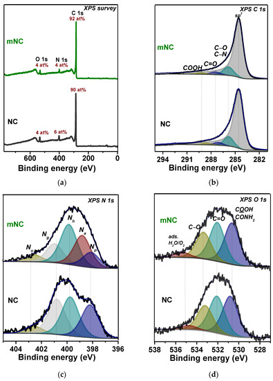 Figure 2 shows data from X-ray photoelectron spectroscopy (XPS), a surface-sensitive quantitative method. The survey spectra of NC and mNC (Figure 2a) contain signals of carbon, nitrogen, and oxygen. The total nitrogen content decreases from 6 at% in NC up to 4 at% in mNC. Note, that the first treatment with KOH causes the nitrogen content drop to 1 at% (Figure S2a). Therefore, subsequent treatment with ammonia partially compensates for this loss of nitrogen. The oxygen content does not change after the two-stage modification.
