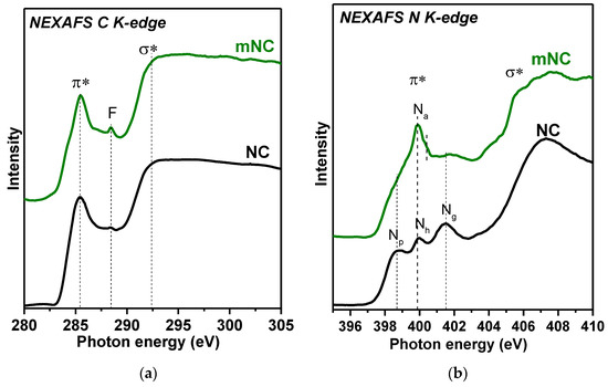 Near-edge X-ray absorption fine structure (NEXAFS) spectroscopy reflects the unoccupied density of electronic states and is used to gain additional information about elements. The NEXAFS C K- and N K-edge spectra of NC and mNC are presented in Figure 3. The main peaks of the C K-edge spectra located at 285.4 eV and 288.5 eV correspond to transitions of core electrons onto the antibonding π* and σ* C=C sp2 states, respectively. The presence of intense narrow π*-peaks in the spectra of both samples reflects the graphite-like structure of carbon shells in as-grown NC, and its retention after modification. Peak F at 288.0 eV, corresponding to carbon atoms connected with oxygen- or hydrogen- or nitrogen-containing groups (π* C=O, σ* C–H, and σ* C–N states) [66,67], has a low intensity in the spectrum of NC. For mNC, the intensity of the peak F increases due to the attachment of extra functional groups during modification. Moreover, the asymmetric line shape of the π*-peak in the spectrum of mNC confirms the embedding of oxygen or nitrogen into aromatic rings [68].