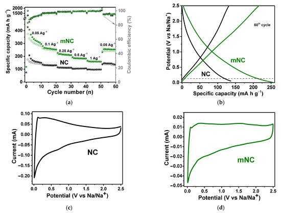 Electrochemical performance of NC and mNC in sodium-ion batteries: (a) rate capability at current densities of 0.05–1.00 A g−1; (b) discharge–charge curves at 60th cycles at 0.05 A g−1; CV curves measured at 0.1 mV s−1 for (c) NC and (d) mNC.
