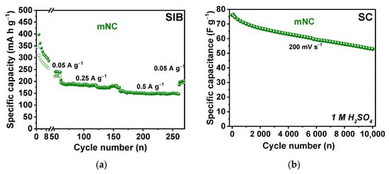 The long-term electrochemical cycling stability of mNC electrode was evaluated in a SIB half-cell and a symmetric SC with 1 M H2SO4 electrolyte. Figure 6a shows the change in the specific capacity of SIB at current densities 0.05, 0.25, and 0.50 A g−1 for 270 cycles. The capacity loss is ~10% at both 0.25 and 0.50 A g−1 for every hundred cycles at a given current density. In the symmetric SC, the initial specific capacitance of 76 F g−1 decreased to 53 F g−1 after 10,000 cycles at a scan rate of 200 mV s−1 (Figure 6b). Consequently, the capacitance retention of the mNC electrode under these conditions is 70%.