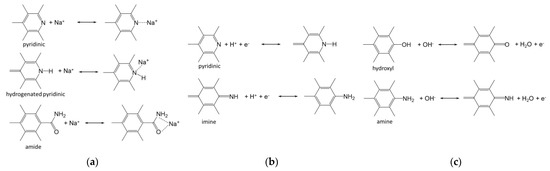 Assumed reversible redox reactions involving functional groups of NC in (a) SIBs and SCs in (b) acidic electrolyte and (c) alkaline electrolyte.
