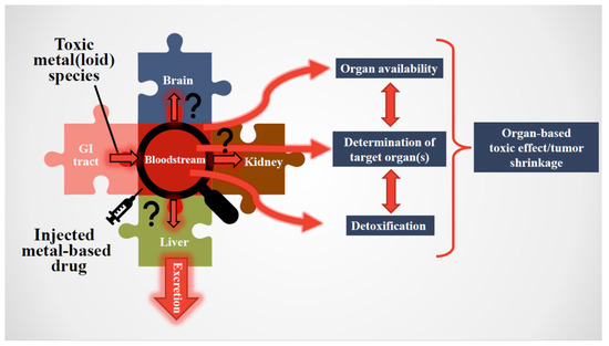 The challenge that pertains to both types of these toxic metal(loid) substances is the need to establish the entire sequence of bioinorganic interactions that occur at the plasma/RBC interface and to integrate them with processes that unfold in organs/tumors (Figure 2). For toxic metal(loid) species, this means revealing the biomolecular mechanisms causing organ damage; for metallodrugs, it also implies screening novel molecular structures which preferentially target the tumor cells, while leaving healthy organs unscathed. Ironically, the effect of these toxic metal(loid) substances on human health are conceptually intertwined in an interesting manner, since specific toxic metal(loid) species are established carcinogens (e.g., inorganic As and Cd [66,67]), while cancer patients are being treated with highly cytotoxic metallodrugs (e.g., cisplatin) to achieve tumor shrinkage/remission that are often associated with severe side-effects.
