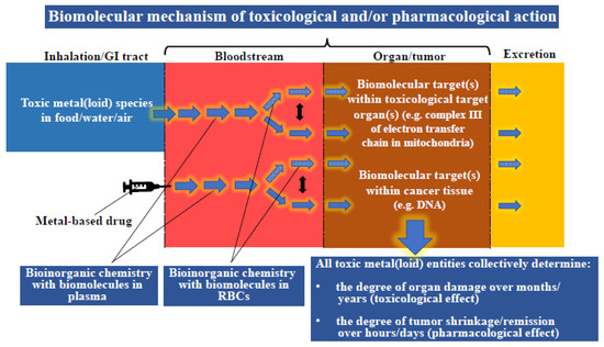 What conceptually relates the exposure of humans to toxic metal(loid) species with the administration of an arsenic-containing drug to patients is the fact that both of these toxic substances infiltrate the systemic blood circulation, which was discovered by William Harvey [10]. His recognition that the bloodstream effectively represents a conveyor belt which supplies human organs with water, life-sustaining oxygen and nutrients (essential elements, vitamins, carbohydrates and lipids) to maintain human health makes this biological fluid one of the first sites where adverse interactions between toxic metal(loid) species/cytotoxic metallodrugs and constituents of the bloodstream unfold (Figure 1) [11,12]. The toxicological and pharmacological relevance of these interactions with constituents of the bloodstream is attributed to the simple fact that they collectively constitute a ‘filter’ which fundamentally determines which toxic-metal-containing species or metabolites thereof will impinge on organs to cause either a detrimental effect, in the case of toxic metal(loid) species, and/or a desirable pharmacological effect in the case of anticancer metallodrugs on a malignant tumor.