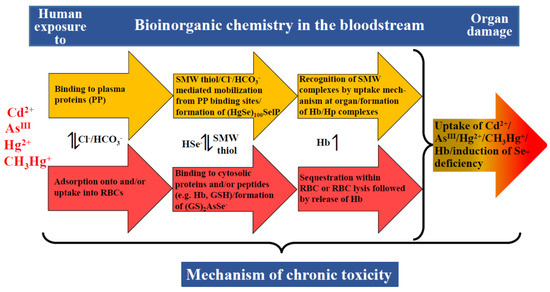 From a mechanistic point of view, chronic human exposure to toxic metal(loid) species can involve three bioinorganic processes that happen in the bloodstream, which may considerably reduce the fraction of the toxic metal(loid) species that is not ‘detoxified’ therein, and therefore, are of toxicological relevance. One important process is the sequestration of a toxic metal(loid) species within RBCs (e.g., CH3Hg+ [88], Cd [89]) or the formation of non-toxic complexes with essential elements, such as selenium either in blood plasma [73] or RBCs [90] (Figure 3). Another process that needs to be considered is a toxic-metal(loid)-species-mediated lysis of RBCs, which releases Hb to plasma where it tightly binds to the plasma protein haptoglobin (Hp). Since the binding capacity of the latter is limited by its plasma concentration, however, the release of too much Hb can result in ‘free’ Hb in plasma which can then cause severe kidney damage [91]. Yet another process by which a toxic metal(loid) species may contribute to organ damage is the gradual induction of a trace-element deficiency based on events that unfold in the bloodstream–organ system [73,81,86].