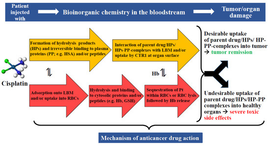The fundamental problem that is associated with the assessment of novel metal entities—at least in our opinion—is that their interactions with constituents of the bloodstream are often not sufficiently considered [123]. We would like to illustrate this important bottleneck in the assessment of novel metal entities based on what is known about the fate of cisplatin in the human bloodstream (Figure 4). While cisplatin is an ideal candidate in this context because we know more about its biochemical fate in the bloodstream than any other anticancer active metallodrug, we point out that this prototypical metallodrug lacks the desired tumor selectivity.