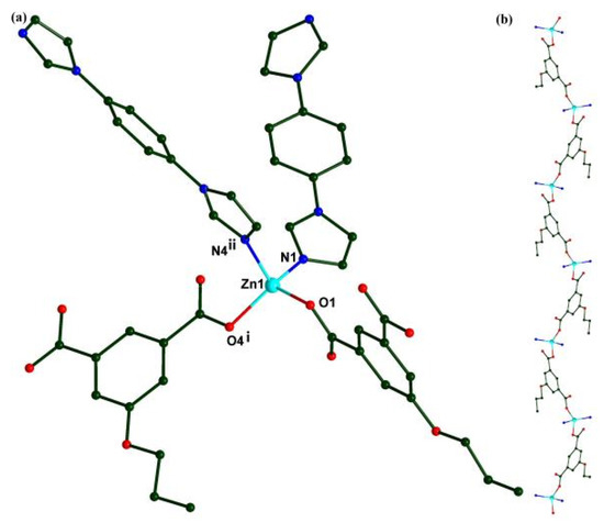 (a) The coordination environment of Zn(II) ions in complex 1. (b) View of the 1D zigzag chain of complex 1. Symmetry codes: i = x + 1/2,−y + 1/2,z + 1/2; ii = −x + 5/2,y − 1/2,−z + 3/2. Color codes: Zn, turquiose; O, red; C, dark green; N, blue.