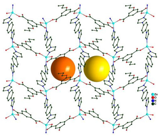 Single-crystal X-ray diffraction results reveal that the titled compound crystallizes in the P21/n space group with the asymmetric unit containing one zinc ion, one 5-PIA anion, and one imbm ligand. Zn1 is four-coordinated by carboxylate oxygen atoms from two different 5-PIA anions and two N atoms from two different imbm ligands, adopting a distorted tetrahedral coordinated sphere (Figure 1A) with the Zn-O, Zn-N distances, and O-Zn-O, O-Zn-N, and N-Zn-N bond angles in the range of 1.9359(17)–2.021(2) Å, and 98.37(8)–121.65(8)°, respectively. The results are in good agreement with other four-coordinated Zn(II) complexes [27]. The 5-PIA anion acts in a bridging-μ2 mode to link two zinc cations, whereas the imbm ligand acts as a trans-bidentate bridging ligand to connect the two Zn(II) ions (Scheme 1). The Zn(II) cations are connected into a zigzag chain through 5-PIA ligands with a Zn···Zn distance of 9.430 Å (Figure 1B). These chains are further linked into a 2D (4,4) network when the zinc ions and the organic ligands are considered as nodes and linkers, respectively (Figure 2). Each 4-membered ring consists of two 5-PIA anions and two imbm ligands, with channels of 4.8 × 13.8 Å2 and 10.0 × 8.3 Å2 along the a-axis.