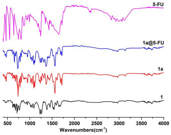 IR spectra of complex 1, complex 1a, 5-FU@1a, and 5-FU.