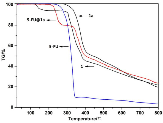 TGA curves of complex 1, complex 1a, 5-FU, and 5-FU@1a.