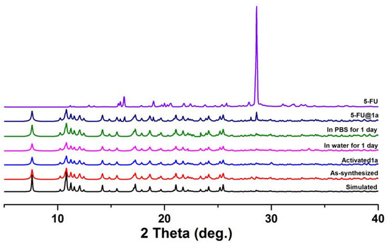 The water stability of complex 1 was explored through XRPD (Figure 5), and the results show that complex 1 is stable in water and PBS solutions. Furthermore, the bulk samples of 1 and 1a samples have been characterized by PXRD, where the experimental pattern matches well with the simulated one, showing good purity of the as-synthesized and activated materials.