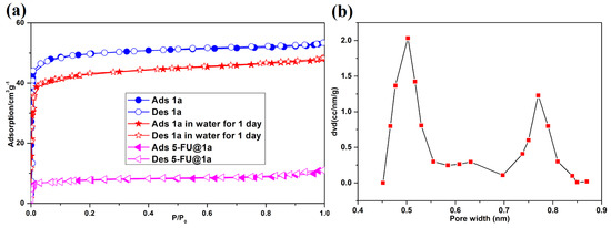 In addition, N2 adsorption measurements were used to examine the porosity of the MOF samples after soaking in water for one day. Complex 1 was activated (1a) at 120 °C for 8 h under vacuum. The N2 absorption isotherm measurement was performed at 77 K and shows a type I isotherm characteristic of a microporous material (Figure 6a) with a BET surface area of 175 m2 g−1. No significant loss in the BET surface area was observed (from 175 to 158 m2 g−1) for complex 1 after soaking in water for one day, indicating the maintenance of the porous structures of complex 1 in water. BET-based specific surface area and total pore volume (at p/p0 = 0.99) of complex 1a were 175 m2/g and 0.201 cm3/g, respectively. A free volume of 19.4% was in good agreement with the theoretically calculated result of 20.1%. The pore size distribution curve had two sharp peaks, indicating complex 1a has bimodal pore size distributions with mean sizes of 5.0 and 7.9 Å, respectively (Figure 6b).