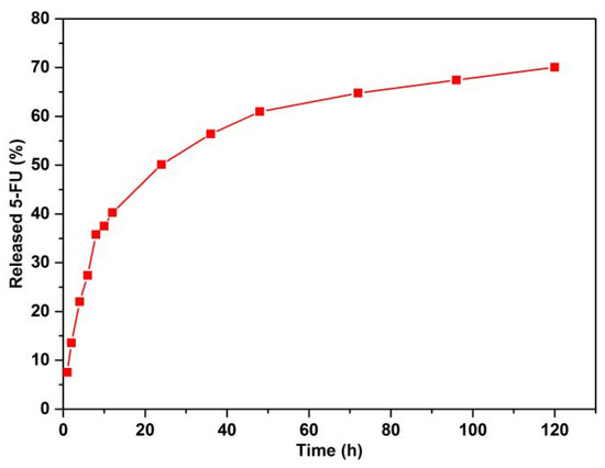 As a result, the loading efficiency of complex 1a reached 19.3 wt%, which is close to the value reported in recently published papers [21,22,23,30,31], but lower than that obtained in other studies [32,33,34]. TGA and elemental analysis were also used to determine the adsorption amount of 5-FU in complex 1a. Weight loss of about 2.0% from 120 to 220 may be attributed to the release of water molecules. Then a sharp weight loss above 220 °C may be due to the release of 5-FU. When the temperature is raised to 350 °C, complex 1 starts to decompose. The loading efficiency of complex 1a was also investigated through elemental analysis, with a value of 20.2 wt%. UV-vis adsorption spectroscopy was used to measure the release of 5-FU drug molecules from 5-FU@1a powder soaked in PBS buffer solution.