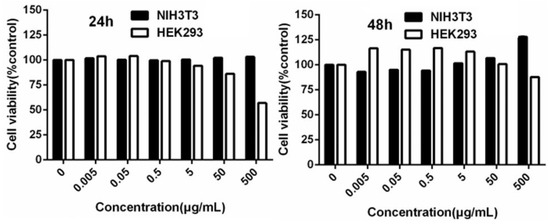 MTT assays were used to determine the viability of NIH-3T3 and HEK-293 cells incubated with complex 1 at different concentrations. When the concentration was below 500 μg/mL for 24 h and 48 h, the survival rate of NIH-3T3 cells was >90%, suggesting that complex 1 had no significant inhibitory effect on the proliferation of NIH-3T3 cells; when the concentrations were less than 5 μg/mL (24 h and 48 h), the survival rate of HEK-293 cells was >90%, and there was no significant inhibition of HEK-293 cell proliferation, but it showed some toxicity between 5–500 μg/mL (Figure 9).