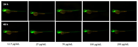Figure 10 shows that the zebrafish behaved normally overall after 24 h of administration. After 48 h of administration, the vessels, which were fluorescently labeled at the same dose, did not show very significant changes, indicating that the inhibition of vessels by the vector was not significant.