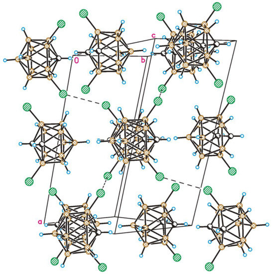 The structure of 3,6-dichloro derivative 3,6-Cl2-1,2-C2B10H10 (7) was determined by single crystal X-ray diffraction. The general view of 7 is presented in Figure 1. In the crystal, the molecule occupies special positions located at the two-fold symmetry axis. The B3-Cl1 bond (1.757(5) Å) is noticeable shorter than the B-Cl bonds in the 9,12-isomer 9,12-Cl2-1,2-C2B10H10 (1.798(2) Å) [80]. In contrast to the crystal structure of the 3,6-diiodo derivative, which is characterized by the presence of the I···I dihalogen bonds of type II (I···I distance 4.067 Å, B-I···I angle is 91.19°) [81], there was not any strong intermolecular interactions in the crystal structure of the titled compound. Weak Cl···Cl dihalogen bonds of type I with a distance of 3.768(3) Å (that is longer than the sum of Van der Waals radii (3.65 Å) [82]) linked molecules into chains along the (101) direction while all the other interactions were Van der Waals (Figure 2).