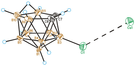 The crystal structure of Cs [3-Cl-7,8-C2B9H11] (11) was determined by single crystal X-ray diffraction. The general view of 3-chloro-nido-carborane with Cs counterion is given in Figure 3. The B3-Cl1 bond length was somewhat longer than that in 7 (1.790 (10) Å). In the crystal there was not even any weak Cl···Cl and Cl···H contacts that was probably due to the presence of the Cs cation which governs crystal packing motifs by the formation of numerous Cs···H and Cs···Cl contacts. Through those contacts, each Cs cation simultaneously binds six carborane cages (Figure 4).