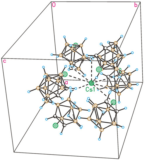 Crystal packing fragment of Cs [3-Cl-7,8-C2B9H11]. The closest environment of the Cs cation is shown by solid dashed lines. The Cs1···Cl1 distances are 3.762 (2) Å and 3.776 (2) Å, the Cs-H distances are in the range of 3.15–3.35 Å.