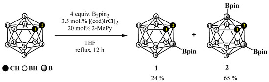 Under an argon atmosphere, ortho-carborane (1.440 g, 10.00 mmol), bis(pinacolato)diboron B2pin2 (1.016 g, 40.00 mmol), and bis(1,5-cyclooctadiene)diiridium (I) dichloride [(cod)Ir(μ-Cl)]2 (235 mg, 0.35 mmol) were placed in a 50 mL two-neck flask and dry THF (10 mL) was added. Then, 2-methylpyridine (196 mg, 207 µL, 2.10 mmol) was added and heated under reflux for 12 h, monitoring the progress of the reaction by thin-layer chromatography (dichloromethane) and 11B NMR spectroscopy. After cooling the reaction mixture to ambient temperature, silica gel was added, and all volatiles were removed on a rotary evaporator. The resulting solid residue was subjected to column chromatography using dichloromethane as the eluent. The first and second fractions were collected and concentrated on a rotary evaporator to obtain white compounds 1 (648 mg, 24%) and 2 (2574 mg, 65%), respectively.