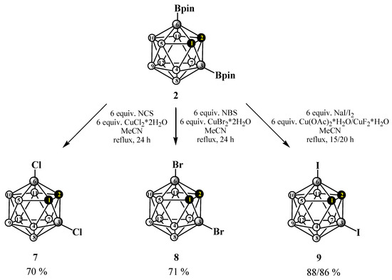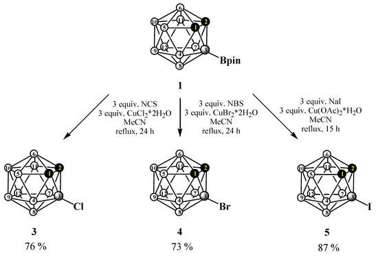 To solve the problem, we have developed a method for the Cu-catalysed halodeboronation of pinacolborane derivatives of ortho-carborane, similar to that used in organic chemistry for halodeboronation of aryl boronic acids [74,75,76,77,78,79].