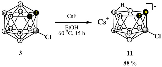 Since the decapitations of 3-bromo and 3-iodo derivatives of ortho-carborane occur selectively with the retention of the substituent, and in the case of the 3-fluoro derivative non-selectively, it was important to understand how the decapitation of the 3-chloro derivative 3 occurs. We found that heating 3 with CsF in ethanol led to selective decapitation of the unsubstituted vertex to form nido-carborane Cs [3-Cl-7,8-C2B9H11] (11) (Scheme 4). Thus, unlike fluorine, the chlorine atom protects the boron atom bound to two carbon atoms from nucleophilic attack.