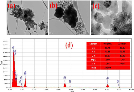 (a–c) TEM results of MgTiO3@g-C3N4 nanohybrids from different spots; (d) EDS obtaining for the synthesized MgTiO3@g-C3N4 nanohybrids.