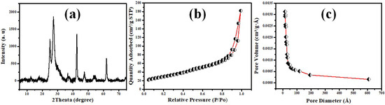 (a) XRD pattern, (b) the hysteresis loop, and (c) pore diameter distribution results of MgTiO3@g-C3N4 nanohybrid.