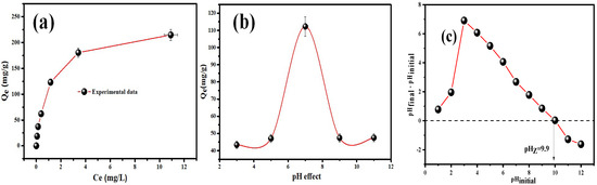 (a) Impact of initial fed concentration, (b) Effect of solution pH on adsorption of RhB by MgTiO3@g-C3N4 nanohybrid from 50 mg L−1 using 10 mg sorbent at 25 °C, and (c) the zero-charge investigation.