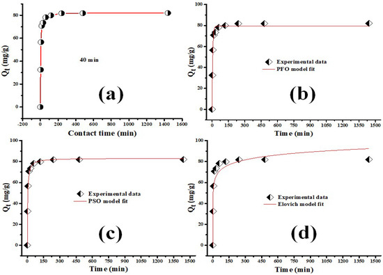 (a) The contact time study, (b–d) kinetic investigation of RhB sorption on MgTiO3@g-C3N4 nanohybrid via the pseudo-first-order model, pseudo-second-order model, and Elovich model, respectively.
