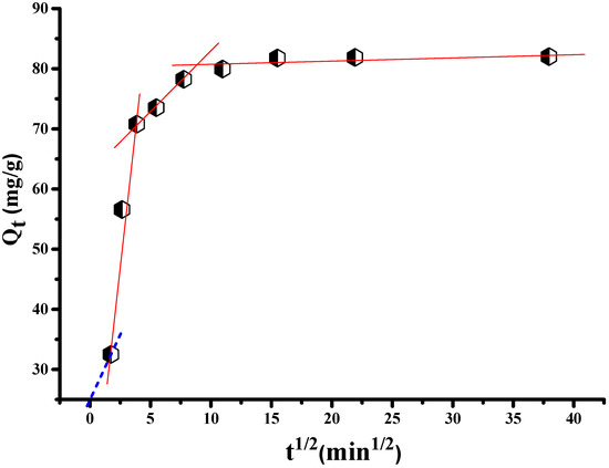 The intraparticle diffusion model (IPDM) was utilized to investigate the RB sorption mechanism onto the MgTiO3@g-C3N4 nanohybrid. According to Equation (6), the obtained qt plot against the t1/2 is monitored in Figure 4.