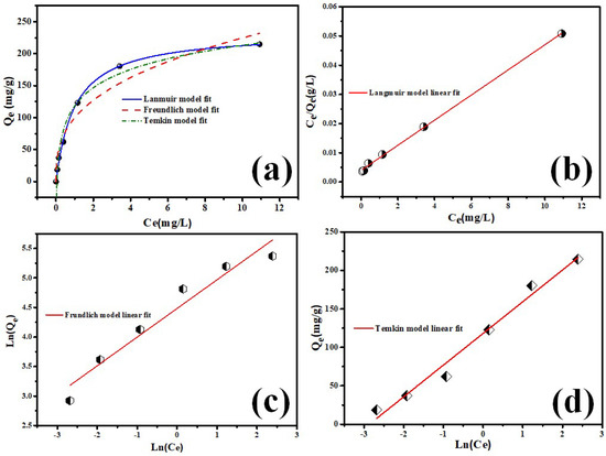 Isotherm investigation for RhB sorption on MgTiO3@g-C3N4 using (a) Nonlinear LIM, FIM, and TIM; (b) Linearized LIM; (c) Linearized FIM; (d) Linearized TIM.