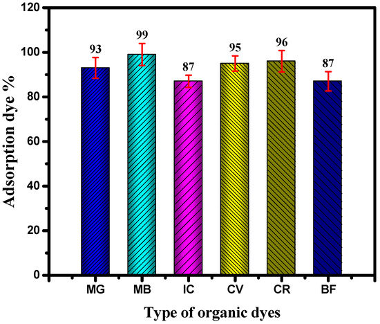 To test the adsorption capability of MgTiO3@g-C3N4 nanohybrid, various dye solutions with fixed concentrations (50 mg/L) were studied. Extraction tests were conducted by combining the obtained MgTiO3@g-C3N4 nanohybrid sorbent (10 mg) with dyes and an aqueous solution (25 mL), in a 50 mL bottle for 24 h at room temperature with magnetic stirring. After centrifuging the dye solutions for 10 min, 5.0 mL of the supernatant solutions recovered. The capacity of MgTiO3@g-C3N4 nanohybrid to adsorb various colors from an aqueous solution was evaluated. Figure 10 depicts the removal percentage of various dyes by MgTiO3@g-C3N4 nanohybrid adsorbent. The obtained results confirmed that the elimination ability percentages of malachite green (MG), methylene blue (MB), indigo carmine (IC), crystal violet (CV), congo red (CR), and basic fuchsin (BF) were 93, 99, 87, 95, 96, and 87%, respectively. However, the uptake of MB and CR dyes was higher than that of other colors.