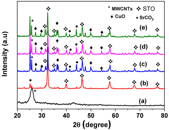 XRD patterns of MWCNTs (a), STO (b), 1% CuO/STO/MWCNTs (c), 3% CuO/STO/MWCNTs (d), and 5% CuO/STO/MWCNTs (e).