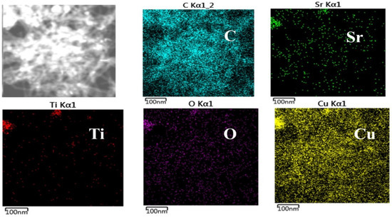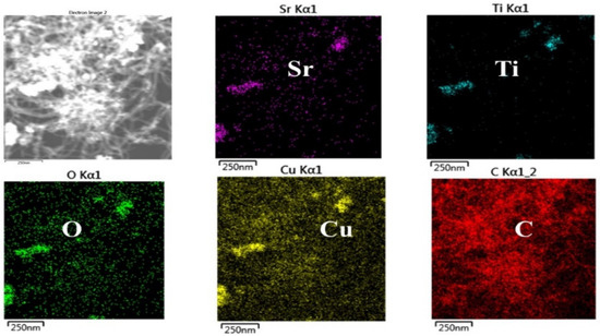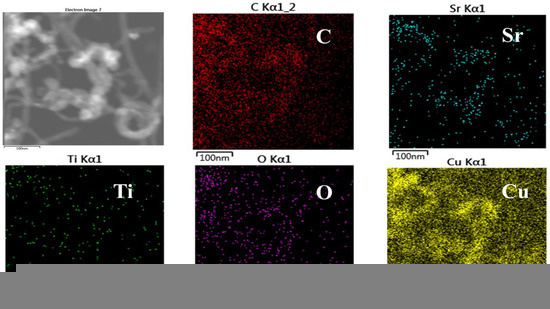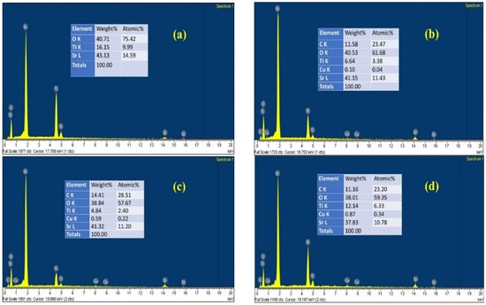 The elemental compositions of the samples were explored through EDX analysis. EDX plots of STO are shown in Figure 2a. One can observe only peaks related to Sr, Ti, and O in Figure 2a, thus expressing the elemental purity of pure STO. On the other hand, signals related to Cu, C appeared in the EDX plot of CuO/STO/MWCNTs, as shown in Figure 2b–d. The evidence for the composition of Cu in CuO/STO/MWCNTs nanocomposites has been proven in the EDX plots.
