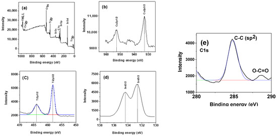 To further evidence the presence of CuO in the nanocomposites, the 5% CuO/STO/ MWCNTs sample was selected to perform XPS analysis. The survey spectra and high-resolution scans of the 5% CuO/STO/ MWCNTs samples are displayed in Figure 3. As shown in Figure 3a, the sample only included Cu, C, Sr, Ti, and O. This was consistent with EDX results. In Figure 3b, spin orbital splitting photoelectrons of Cu 2p3/2 and Cu 2p1/2 were placed at 933.6 and 952.6 eV, which corresponded to CuO [34,35]. From Figure 3c, the respective binding energies of Ti 2p1/2 and Ti 2p3/2 were located at 464.0 and 458.2 eV. The two respective binding energies were assigned to typical Ti4+ [36]. The binding energies of Sr d3/2 and Sr d5/2 were 134.4 and 133.5 eV, respectively (Figure 3d). The two bands were assigned to typical Sr2+ [37]. The high-resolution spectra of C 1s shows that the C 1s peak centered at 284.6 and 288.7 eV, which corresponds to C–C sp2 and O–C=O, respectively (Figure 3e) [38]. The results obtained from XPS analysis confirmed the element Cu in the nanocomposites is in the form of CuO.