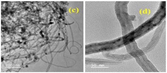 TEM images of STO, 5% CuO/STO, and 5% CuO/STO/MWCNTs were taken to understand their morphology, size, and distribution of constituents. As shown in Figure 4a,b, the STO nanoparticles existed in the size of approximately 15 nm. The morphology of 5% CuO/STO/MWCNTs is shown in Figure 4c, where the MWCNTs remained in nano-sized tubular shape, and the size of tubular was approximately 25 nm wide. From Figure 4d, it can be seen that some nanoparticles were firmly attached to the wall of the carbon nanotube. These nanoparticles can be considered as CuO/STO in the nanocomposites.