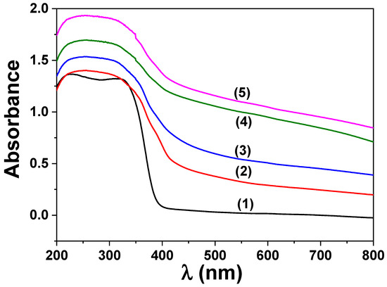 DRS spectra of STO (1), STO/MWCNTs (2), 1% CuO/STO/MWCNTs (3), 3% CuO/STO/MWCNTs (4), and 5% CuO/STO/MWCNTs (5).