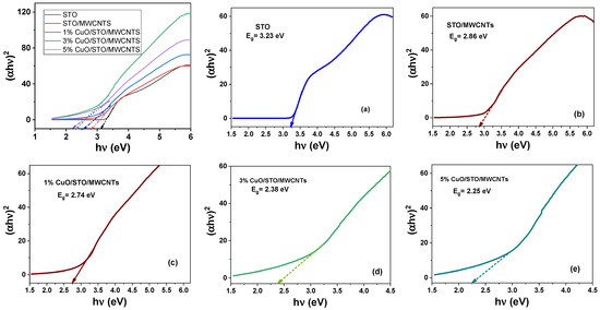 The band gap energy of STO (a), STO/MWCNTs (b), 1% CuO/STO/MWCNTs (c), 3% CuO/STO/MWCNTs (d), 5% CuO/STO/MWCNTs (e).