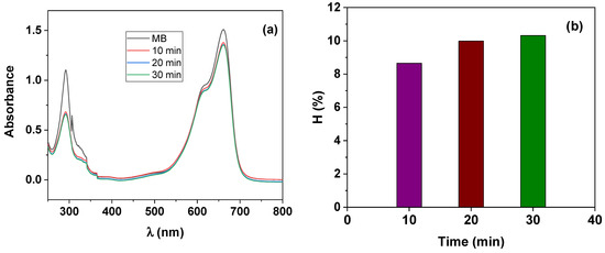 To investigate the adsorption performance of the materials, the beaker was placed in the dark with constant magnetic stirring. As shown in Figure 9a, after 30 min, the adsorption/desorption equilibrium was reached. The adsorption percentages (H%) were about 10% under dark adsorption (Figure 9b).