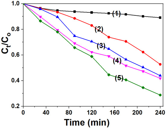 The plots of ln(Co/Ct) in the presence of (1) STO, (2) STO/MWCNTs, (3) 1% CuO/STO/MWCNTs, (4) 3% CuO/STO/MWCNTs, (5) 5% CuO/STO/MWCNTs.