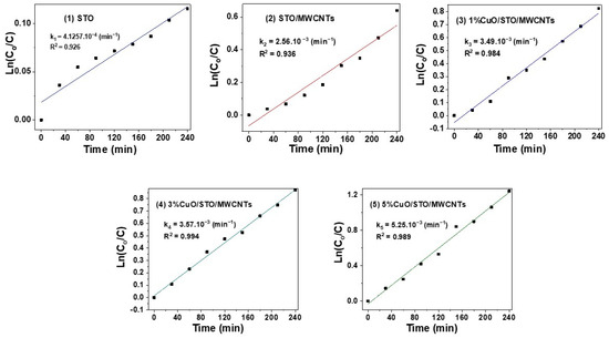 With the higher coefficient of determination (R2 > 0.9), the proposed model demonstrated high compatibility. Table 1 shows the estimated parameters, including the pseudo-first-order rate constant k and R2 values. The first order rate constants of 5% CuO/STO/MWCNTs and pure STO were 0.525 × 10−2 min−1 and 0.0412 × 10−2 min−1. It can be seen that the first order rate constant of 5% CuO/STO/MWCNTs was 12.7 times faster than that of pure STO. Besides, the high R2 values of the samples also confirmed the adherence of the photocatalytic reaction of MB degradation to the first-order kinetics.